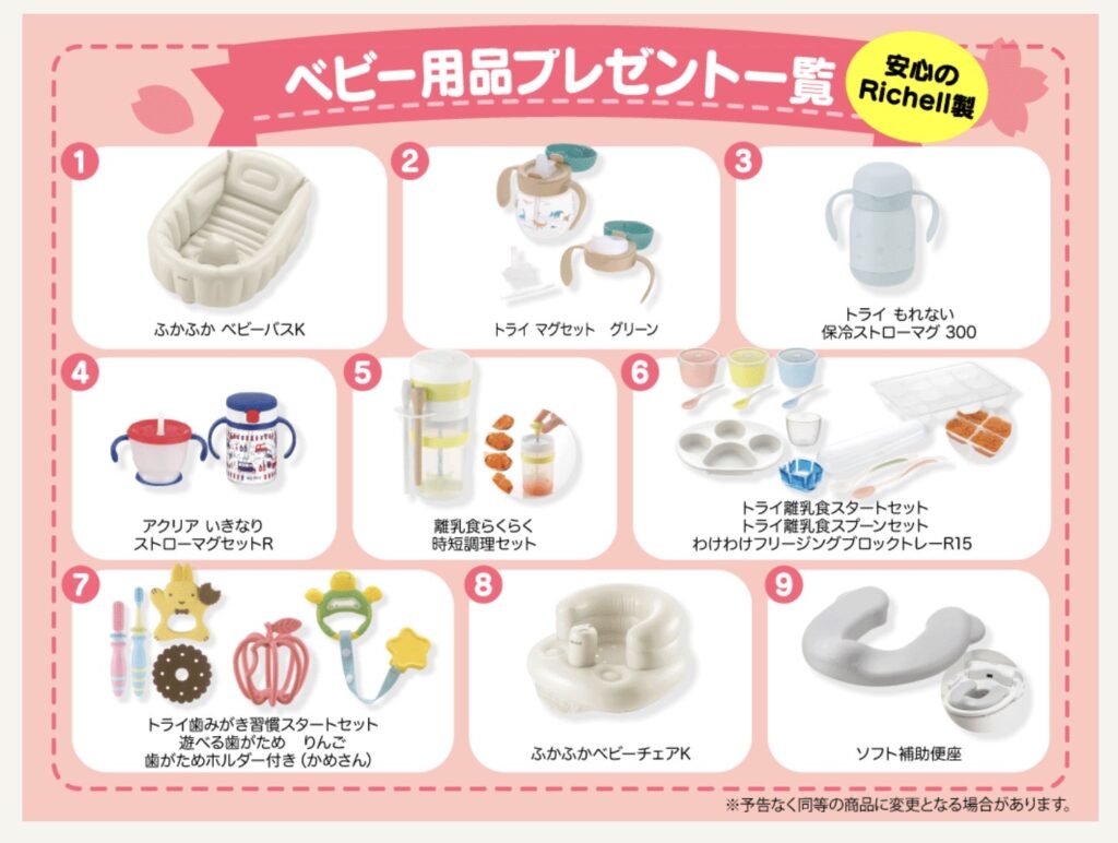 プレゼントされるベビー用品はすべて「Richell」の商品なので安心です。